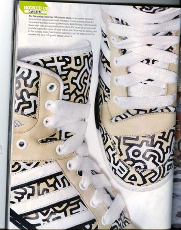 Lors d'un recent défilé de Jeremy Scott, on a pu voir une Adidas inédite, qui reprenait des visuels du regrétté Keith Haring.