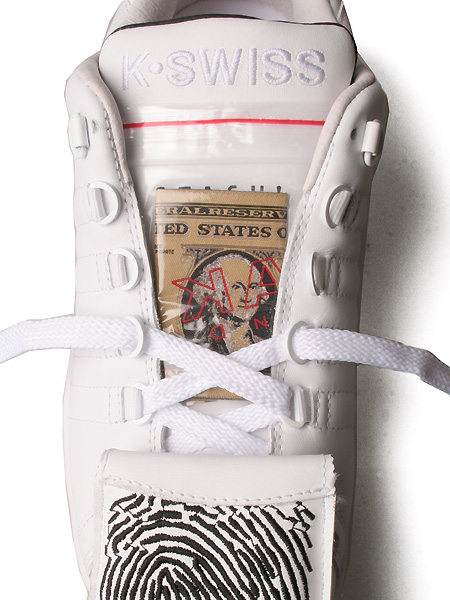Ainsi, Desiree Mejer, fondatrice et styliste de la marque punk et mode Fake London vient de nouveau de relooker deux modèles K-Swiss tongue-twistés.