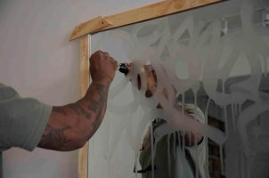 Ainsi, Earsnot et Semen du crew Irak s’en sont donné à coeur joie pour produire de gigantesques mirroirs recouverts au choix de leurs tags à l’acide ou à la pierre ponce alors que KR s’amusait à recouvrir une série de tables de des fameux drippings dont il a le secret. Si le tag est tout sauf destiné à embellir les appartements et bureaux, nul doute que le projet Private Property crédibilise néanmois un peu plus l’acquisition de pièces réalisées par des taggeurs, car les mediums et le propos sont bien plus interessants ici que dans la majorité des cas présentés en galeries.