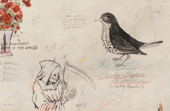 Fait suffisamment rare pour être souligné, l’artiste de Brooklyn présente aussi trois sublimes crânes en bronze, présentés sur des plaques en marbre, appuyant comme s’il le fallait encore, l’atmosphère pesante dans laquelle il aime nous faire pénétrer.